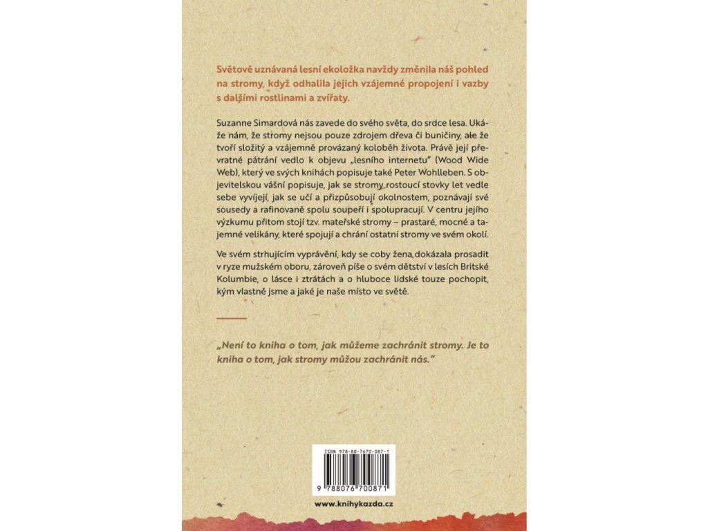 Suzanne Simardová nás zavede do svého světa, do srdce lesa. Ukáže nám, že stromy nejsou pouze zdrojem dřeva či buničiny, ale že tvoří složitý a vzájemně provázaný koloběh života. Právě její převratné pátrání vedlo k objevu „lesního internetu“ (Wood Wide Web), který ve svých knihách popisuje také Peter Wohlleben. S objevitelskou vášní popisuje, jak se stromy rostoucí stovky let vedle sebe vyvíjejí, jak se učí a přizpůsobují okolnostem, poznávají své sousedy a rafinovaně spolu soupeří i spolupracují. V centru jejího výzkumu přitom stojí tzv. mateřské stromy – prastaré, mocné a tajemné velikány, které spojují a chrání ostatní stromy ve svém okolí.
